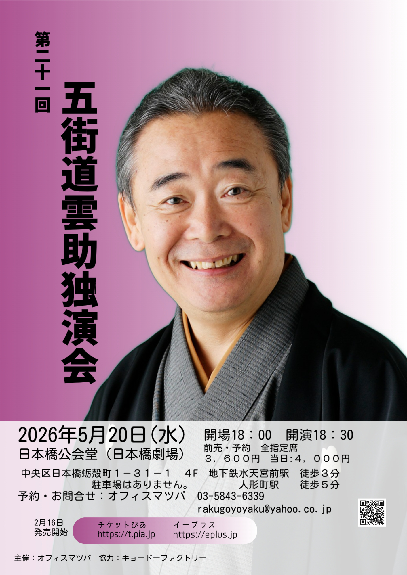 チケットご予約・お問い合わせ チケットぴあ イープラス オフィスマツバ(03-5843-6339 rakugoyoyaku@yahoo.co.jp)