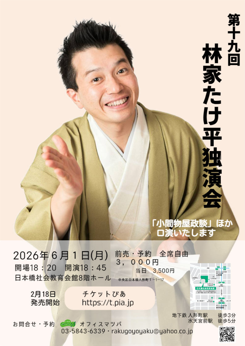 チケットご予約・お問い合わせ チケットぴあ オフィスマツバ(03-5843-6339 rakugoyoyaku@yahoo.co.jp)