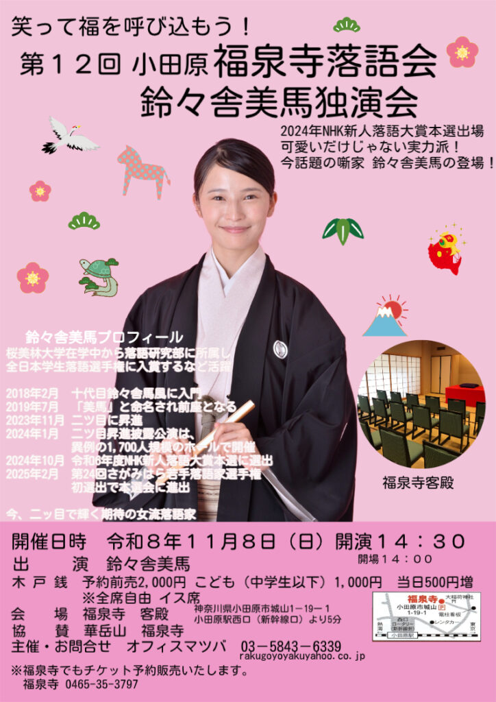チケットご予約・お問い合わせ オフィスマツバ(03-5843-6339 rakugoyoyaku@yahoo.co.jp) 福泉寺でもチケット発売中